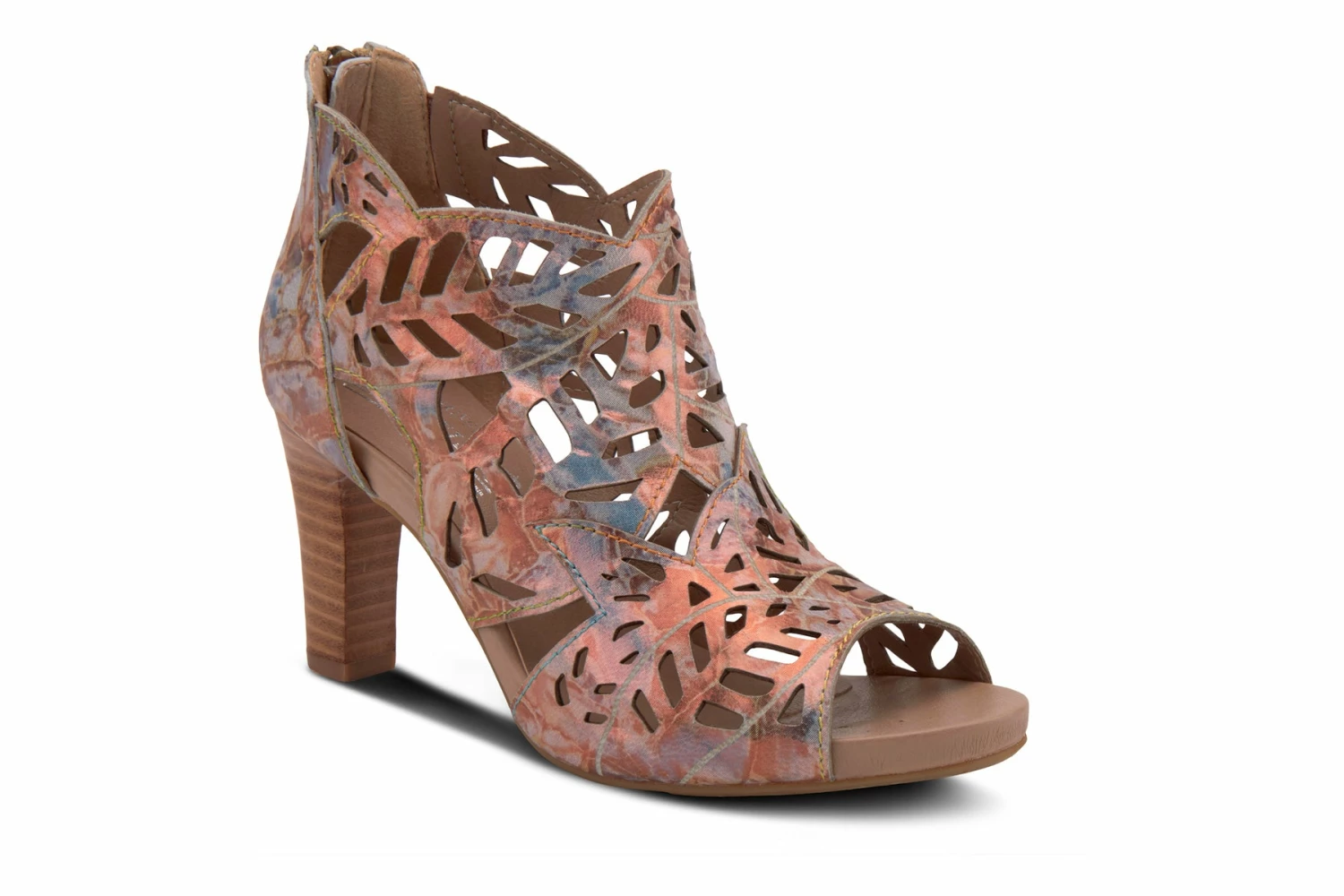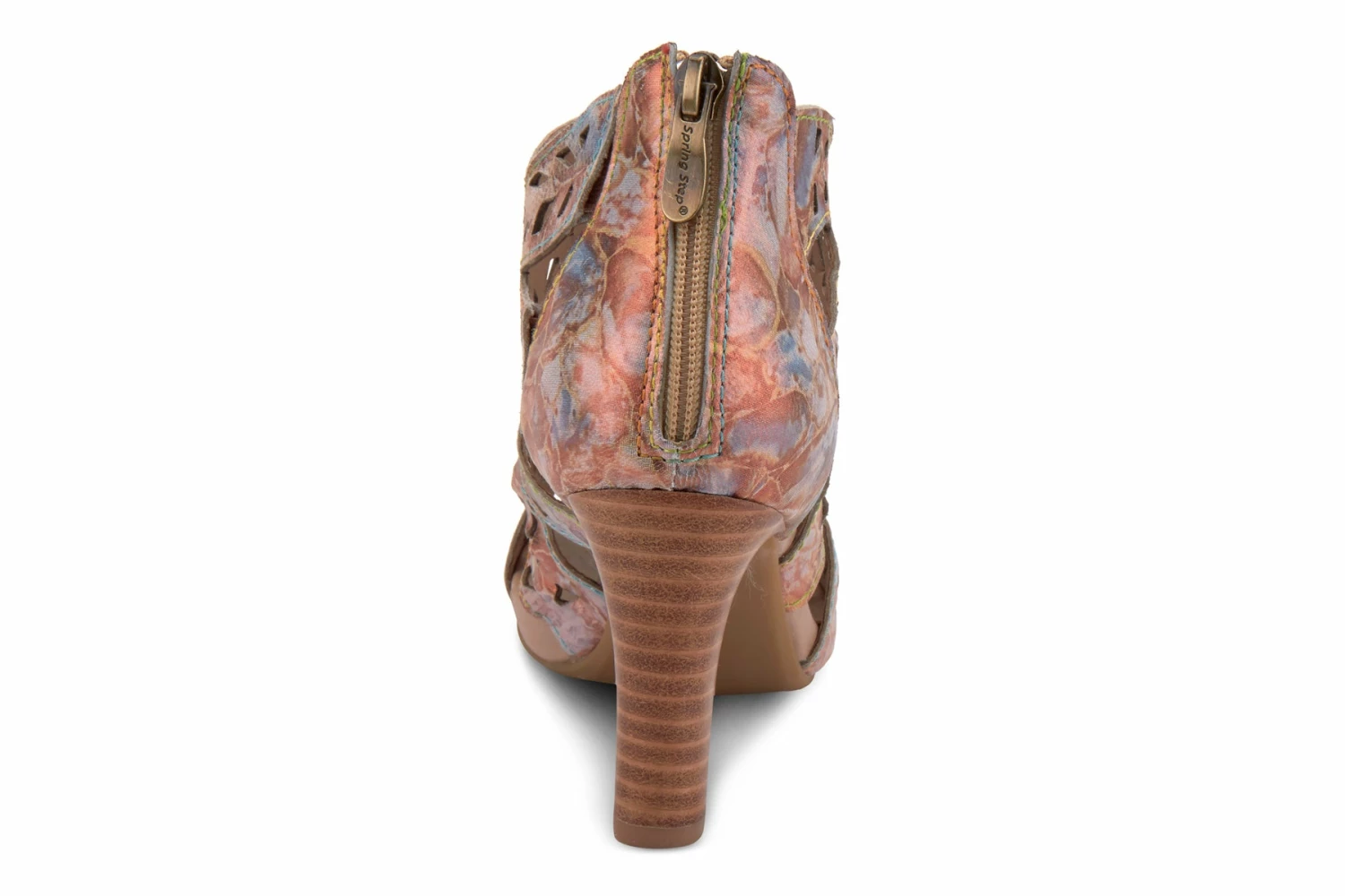 French inspired design, hand-painted leather peep toe laser-cut bootie. Heel Height (approximately): 3 1/4″ stacked, 1/2″ platform.