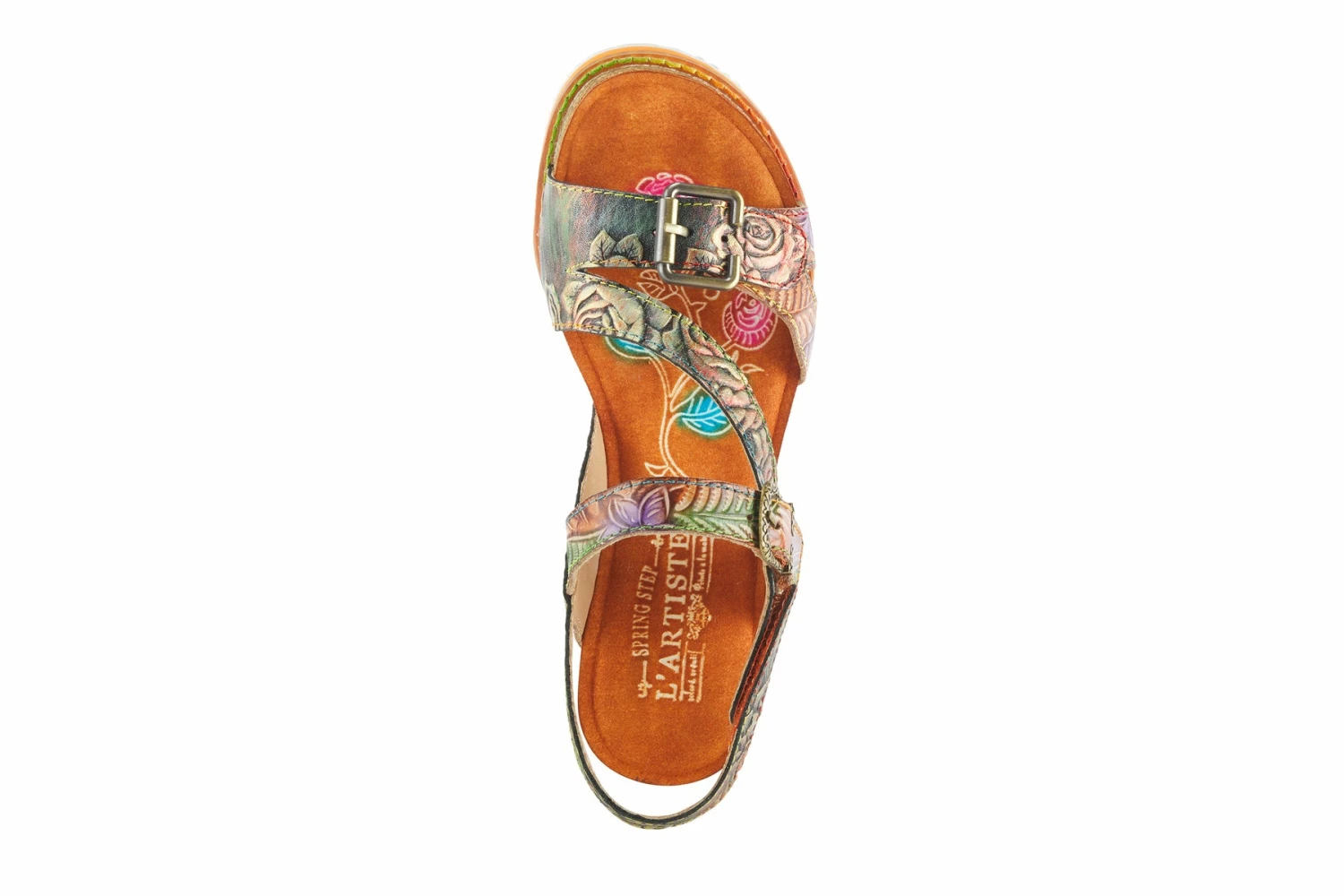 This ultra-feminine wedge heel has such great details with the decorative metal buckles and buttons. Hand-painted all the way from the outsole to the insole so that you never stop looking at the design.