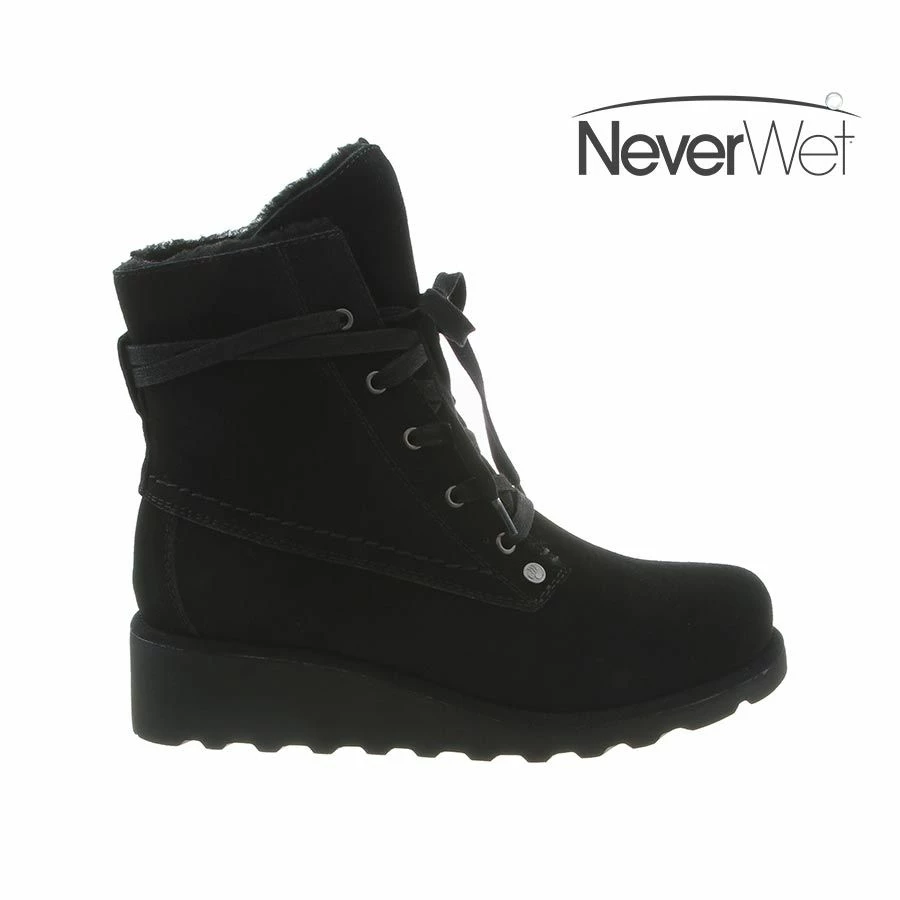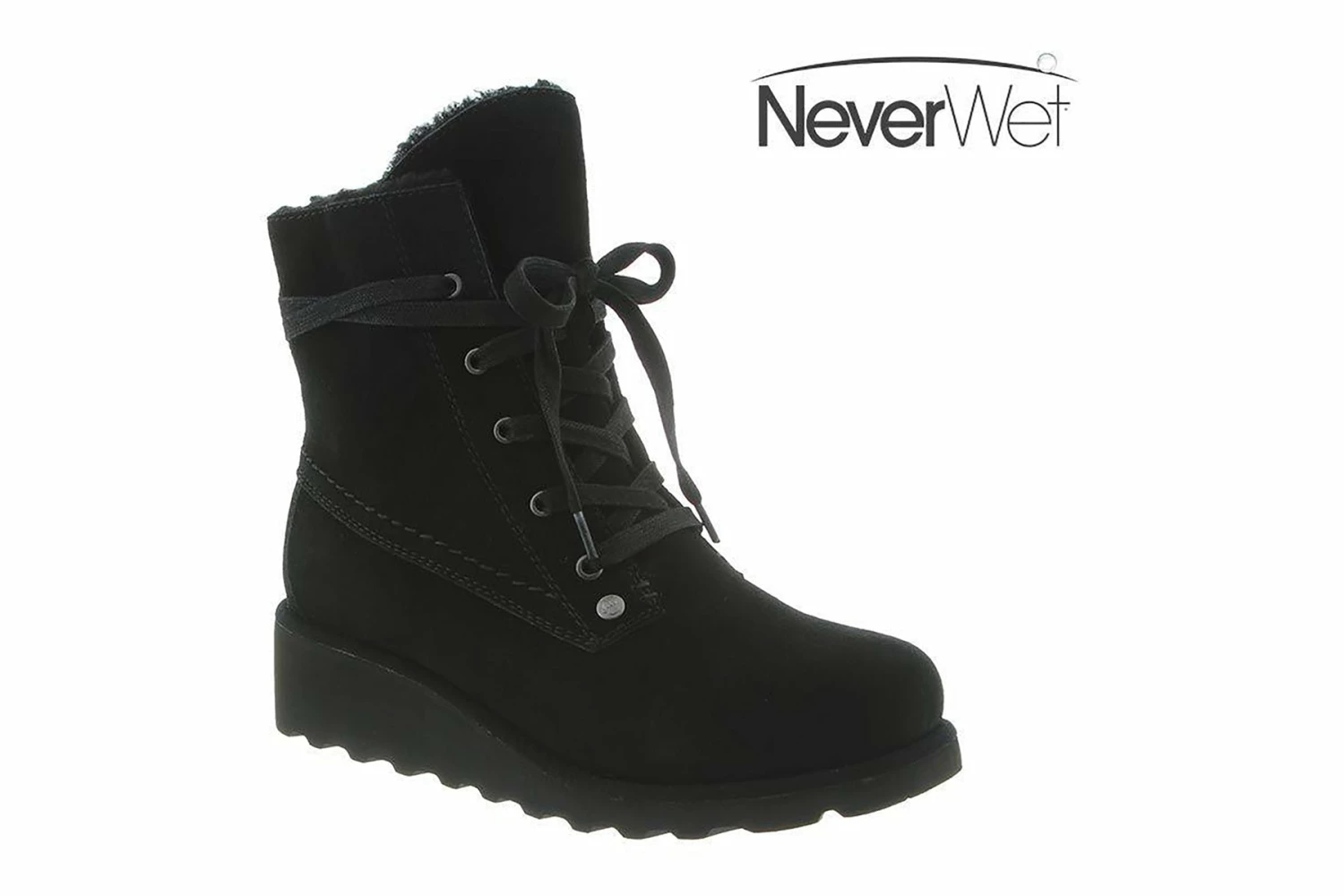 Bearpaw Krista is a snow boot designed for comfort. These chic boots have suede or wool uppers, comfortable shearling footbeds and blown rubber outsoles. Your feet will enjoy a 5 ½ inch shaft height, wool blend lining and cotton lacing wraps that go around the back and ties in front.