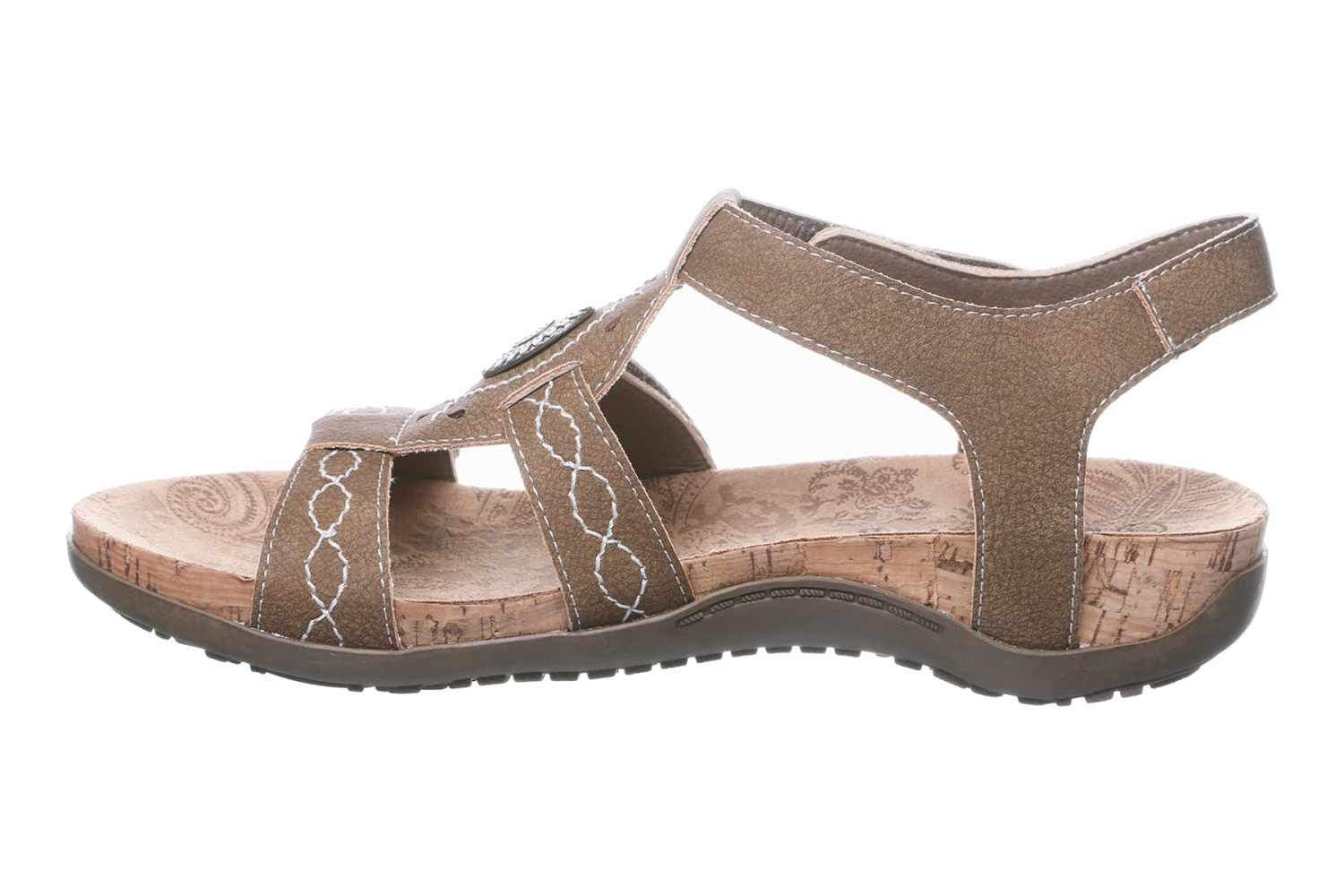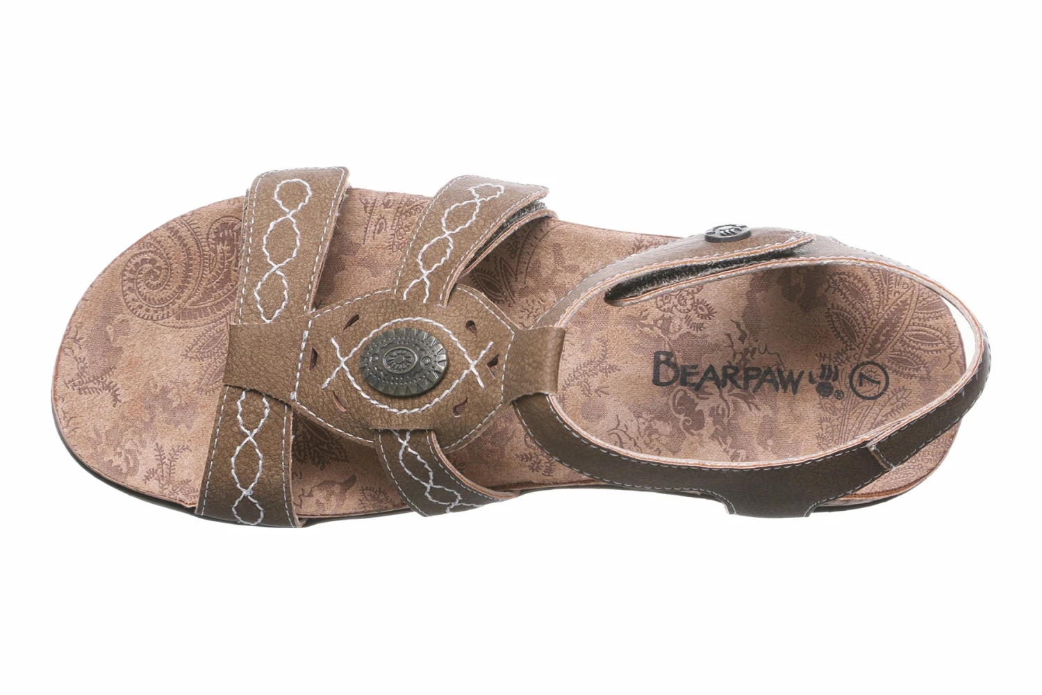 Bearpaw Ridley II is a fashionable spring and summer sandal. Faux leather uppers and linings, cushioned EVA midsole and TPR outsole keeps feet feeling great. Adjustable hook and loop straps add support, while an open toe provides breathability and comfort.