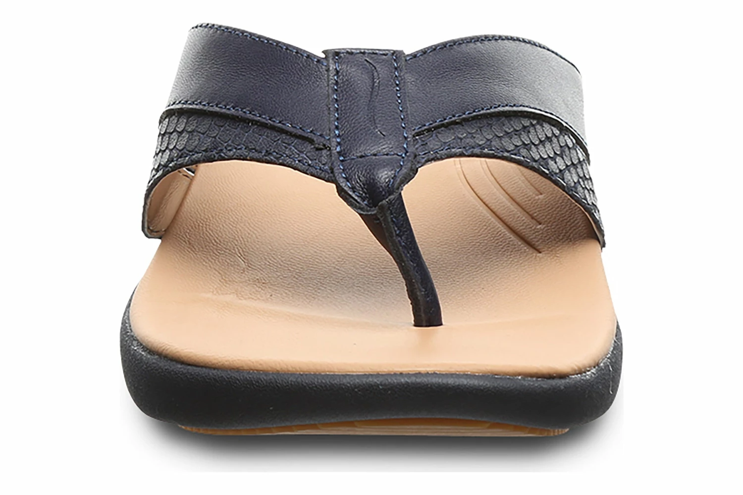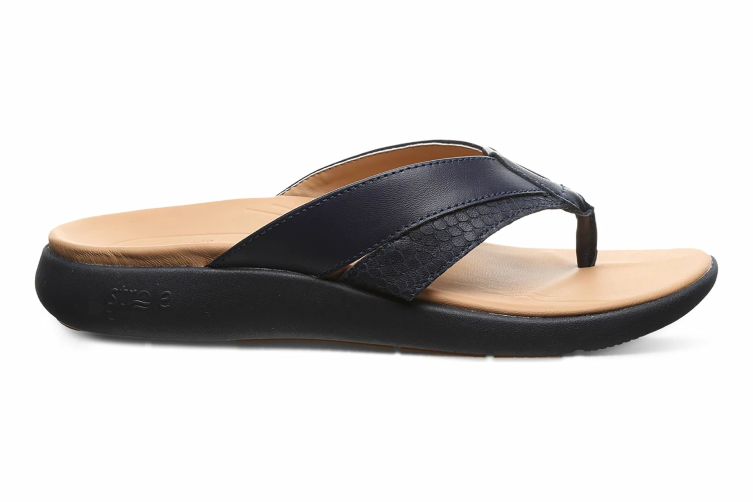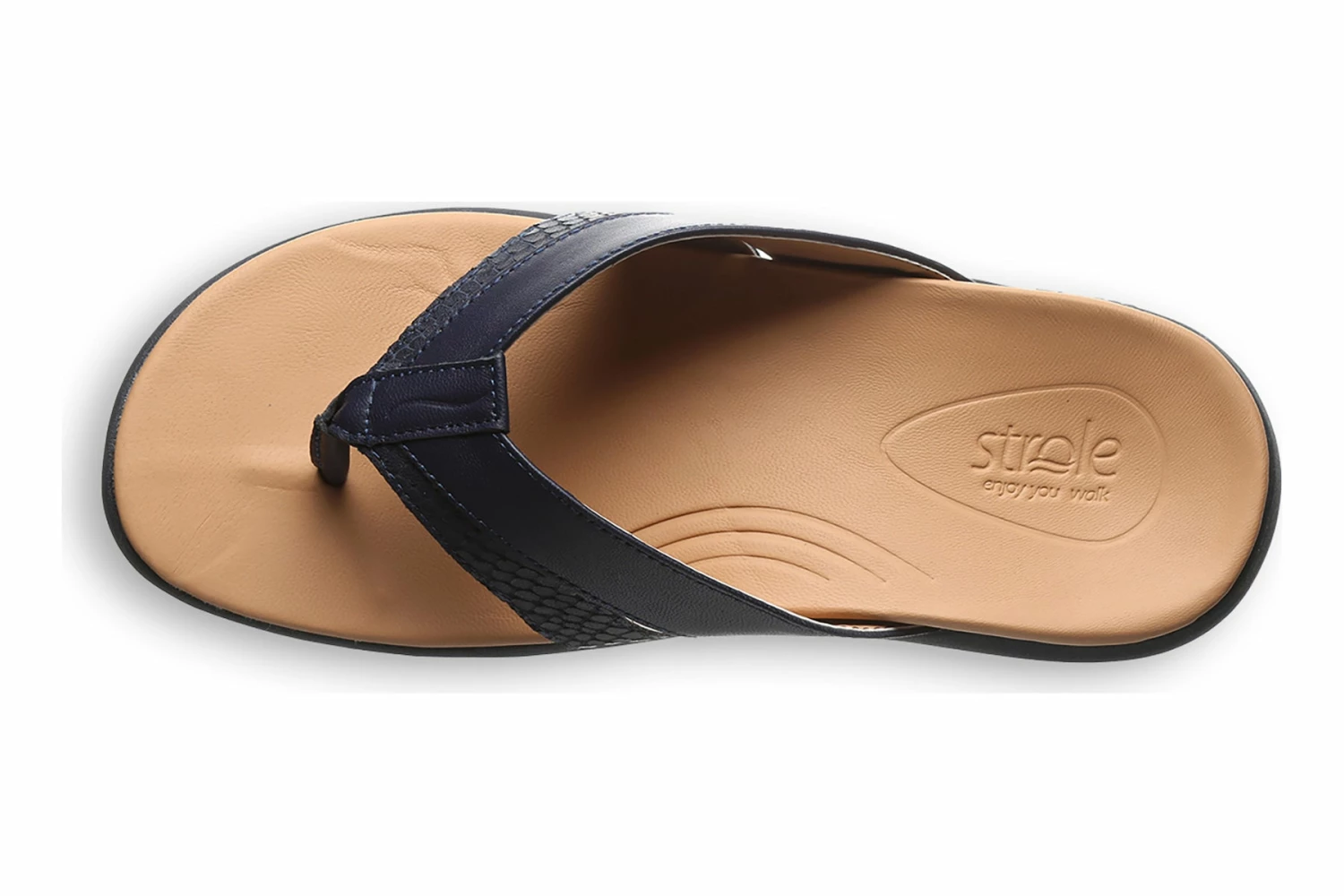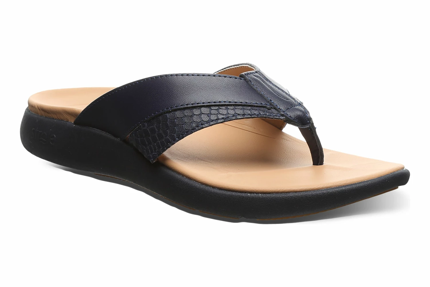 Strole Bliss is a classic toe post sandal built for comfort. Prominent features include colorful leather uppers, sheep leather footbed and non-slip EVA outsole. Textured straps provide an elegant and stylish appearance, while the corrective uplift cradle support system offers arch support and rebound cushioning.