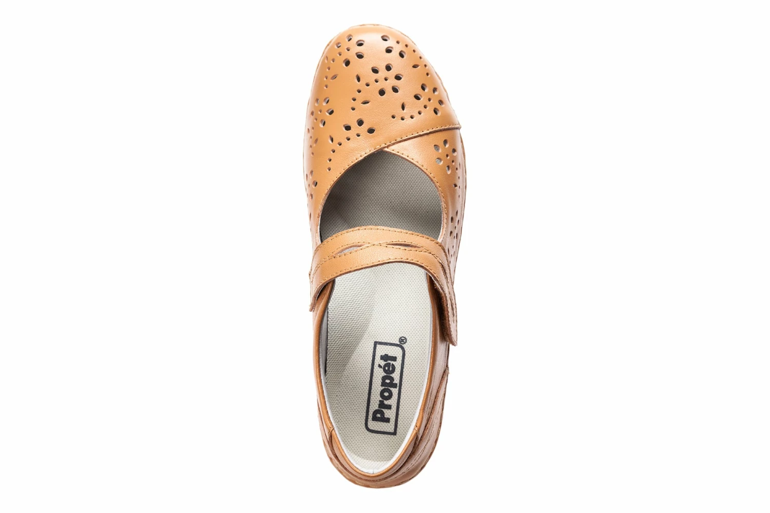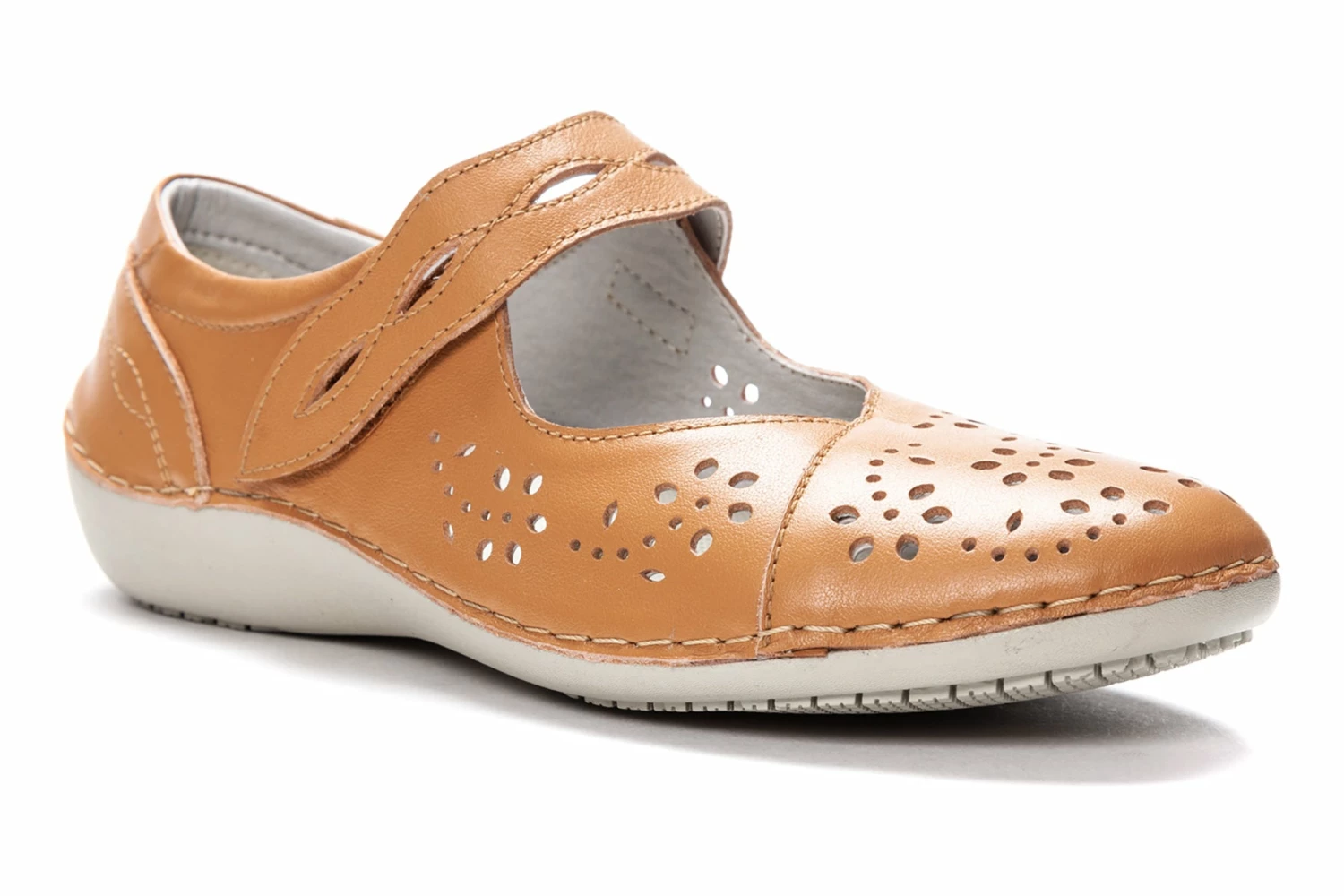 Full grain leather mary jane with hook and loop strap closure. Arch supporting high density open cell PU foam allows air to flow for a cooler, healthier footbed. Flexible and light rubber outsole gives extra grip on all surfaces.