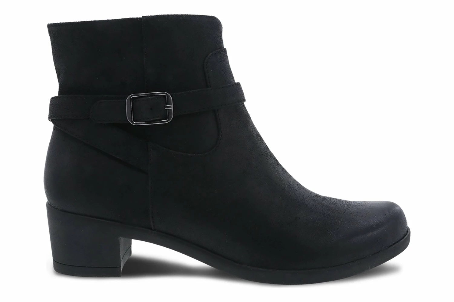 The Cagney is a heeled boot with a straight topline and a buckle strap, giving you a modern look. Perfect with a dress or a pair of skinny jeans, the Cagney features burnished suede uppers treated with 3M Scotchgard for stain resistance, leather uppers, lined with a combination of chrome-free and 100% recycled textile linings, a removable footbed with Dansko Natural Arch technology, and a rubber outsole for long-lasting wear.