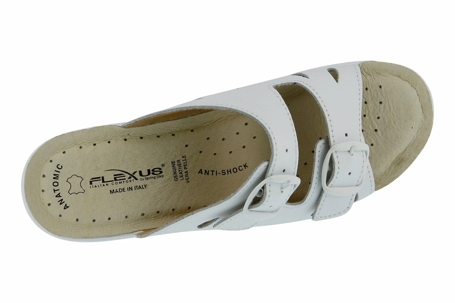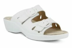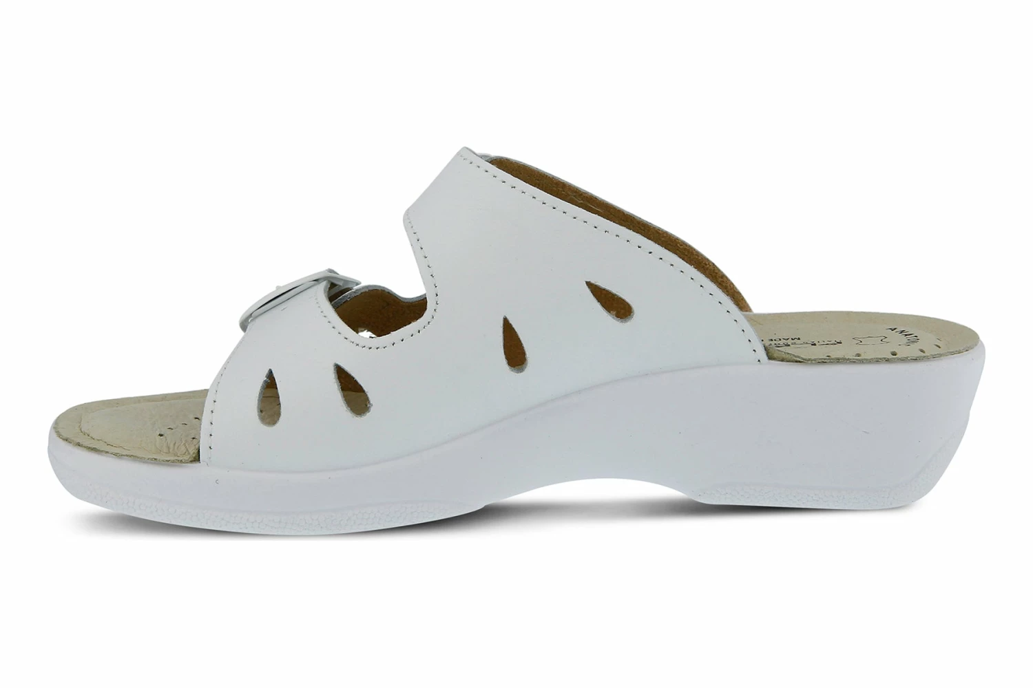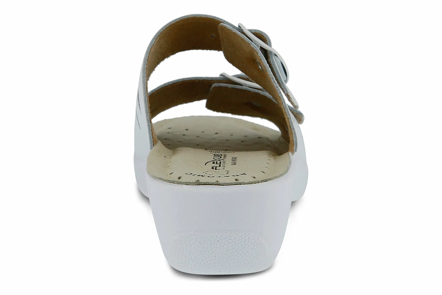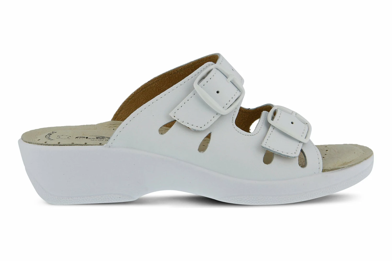 Italian-made, slide leather sandals fashioned with metal buckles.