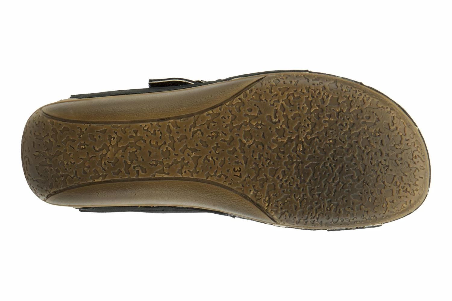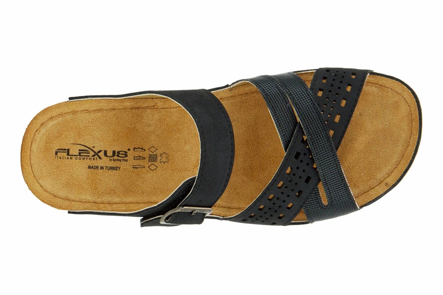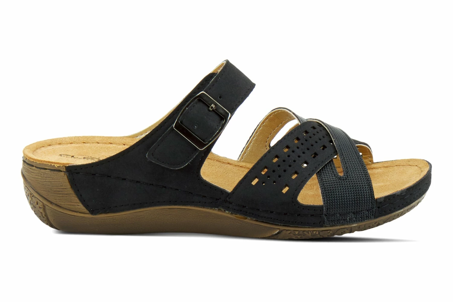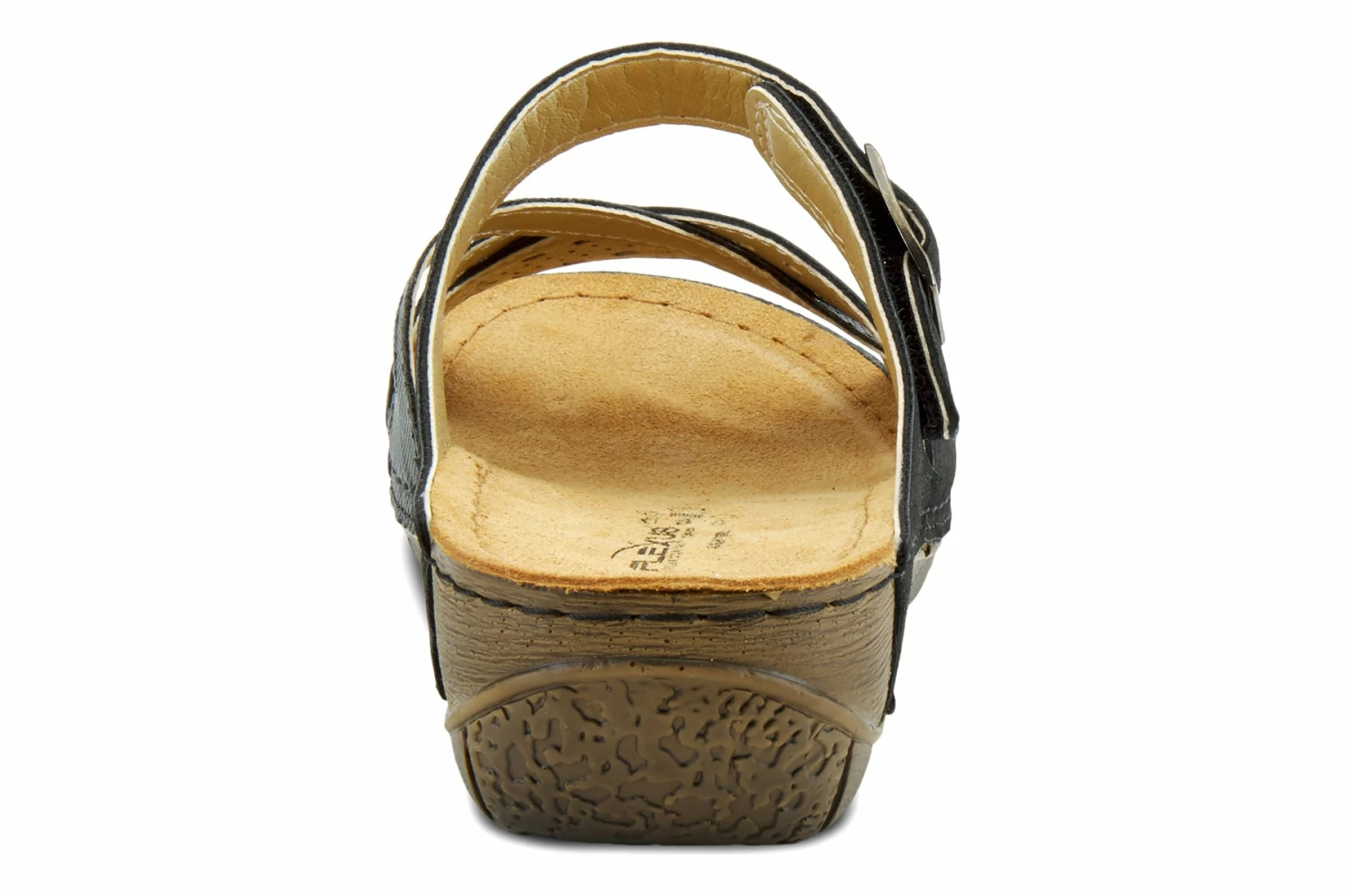 Two tone and textured slide with adjustable hook & loop fastening and shiny metal buckle detail, featuring cross over straps with cut outs, all on a polyurethane wedge outsole with heavy stitch detail.