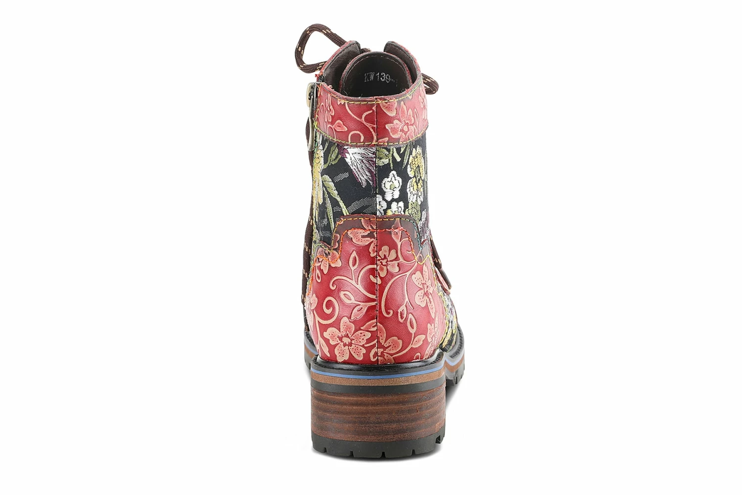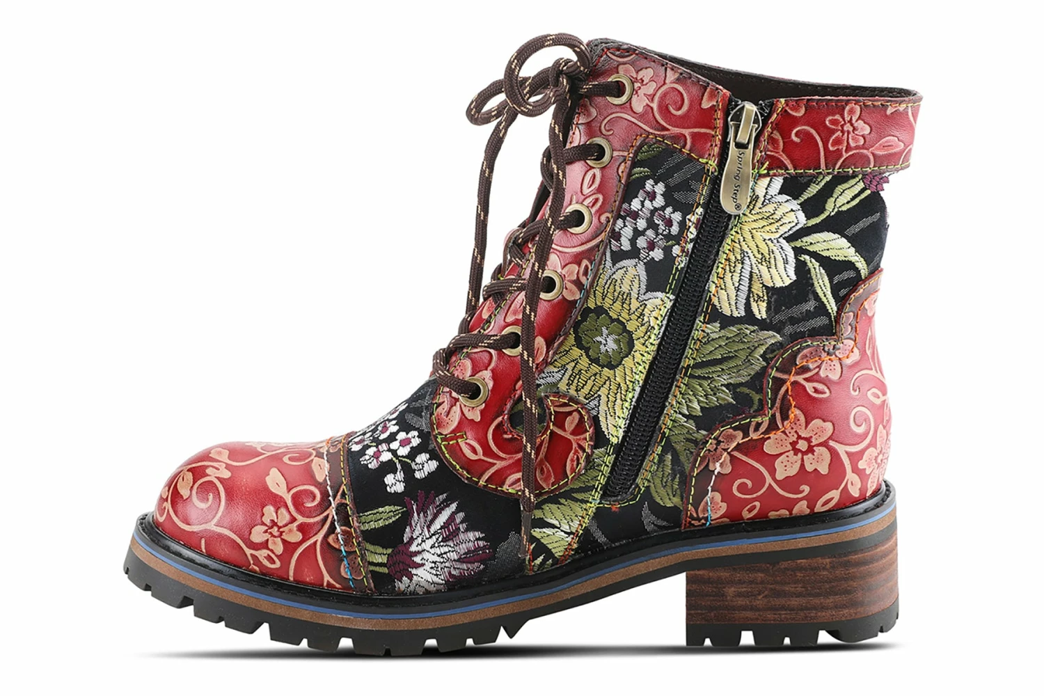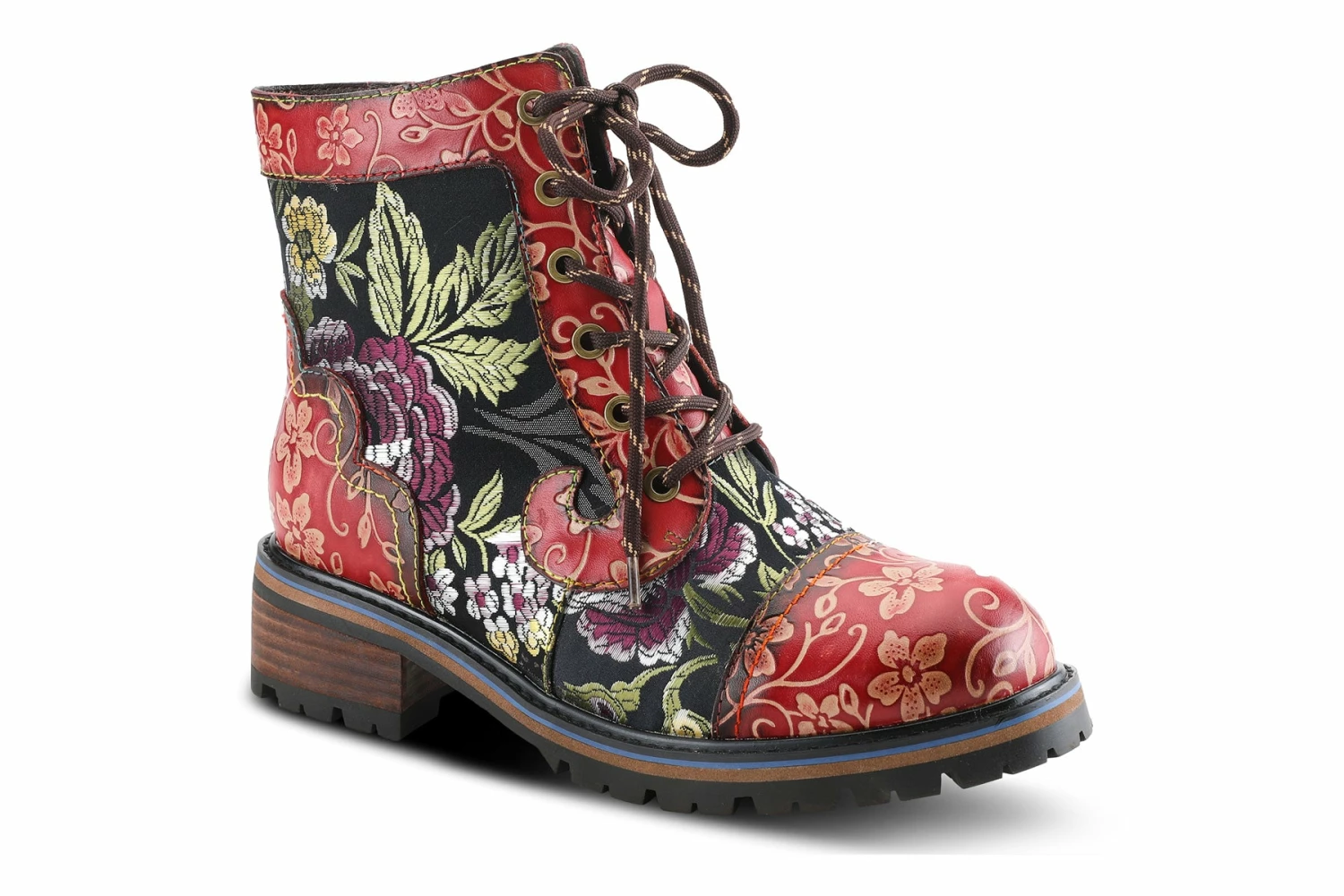 L`Artiste FANTASTIC Incredible leather combination bootie showing an embroidered textile and embossed floral leather on a comfort lug sole.