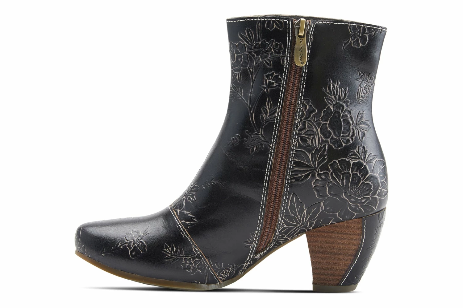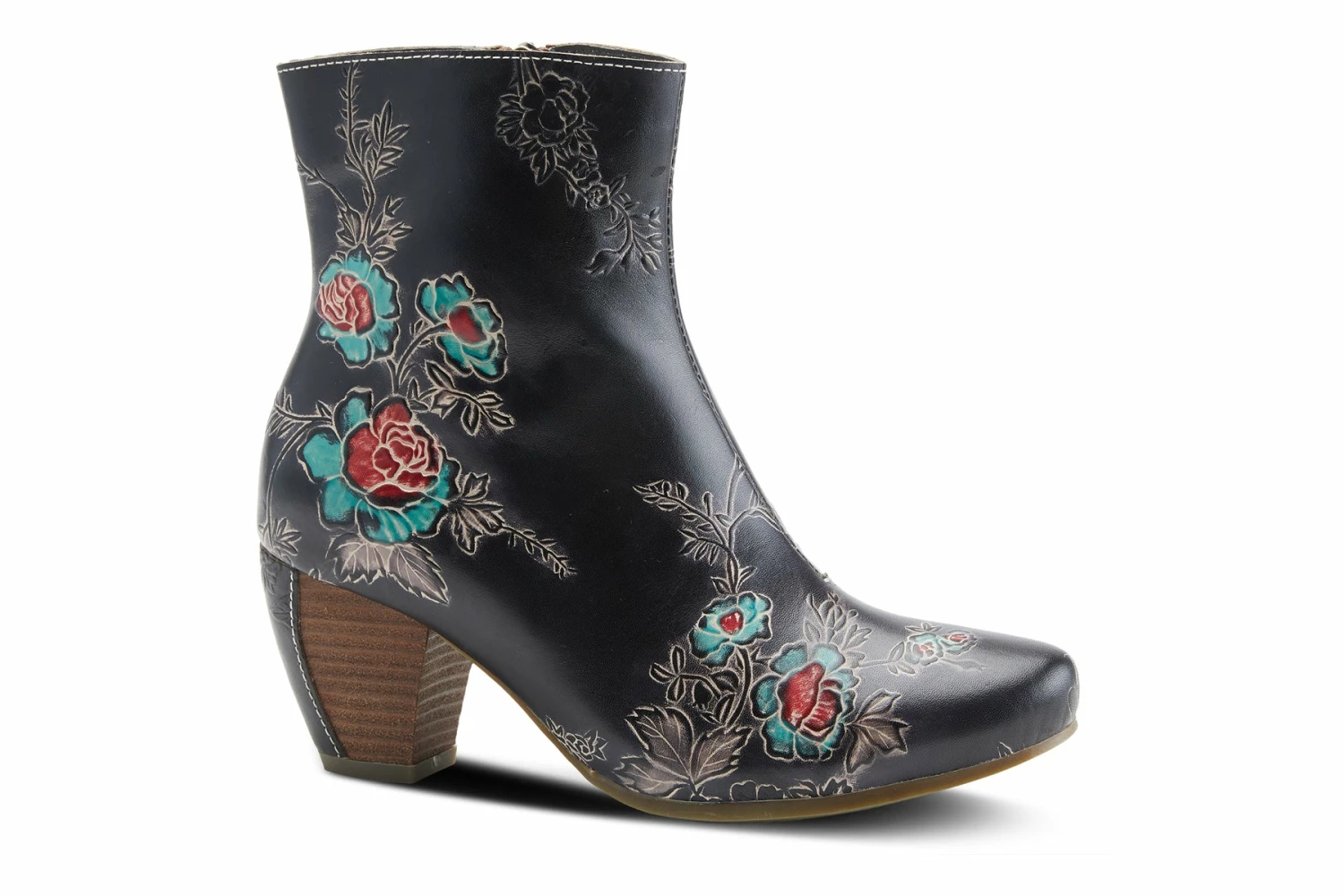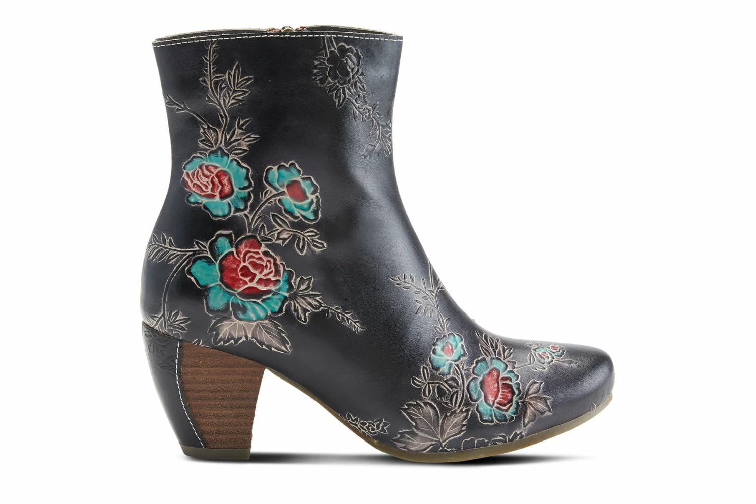 L`Artiste Style: Folka -Premium genuine leather boots with embossed multi color floral details, an inside zipper for easy on and off on a stacked curvy heel with leather piece on the back.