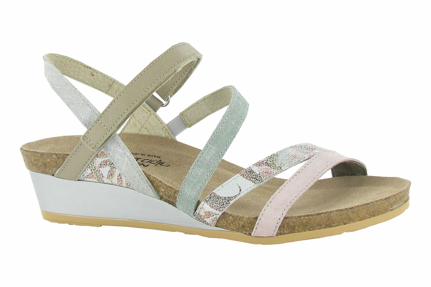 Naot Hero is a stylish wedge sandal with contrasting leathers. An ankle strap offers stability and cork and latex footbed molds to the shape of the foot. An elastic instep strap allows for ease of wear, while a leather lining provides for extra comfort.