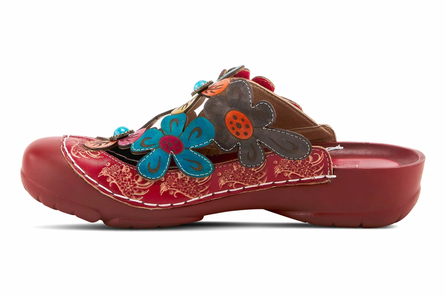 Bright and colorful hand-painted leather clog detailed with flowers and two turquoise color stones set in an antique metal casing to accent the center, all with a water-friendly toe cap and comfort sole.
