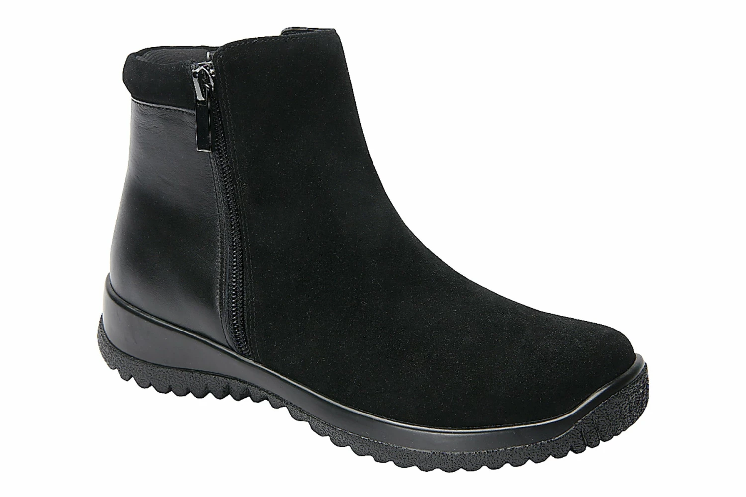 The women’s Drew Kool ankle boot offers everyday style with unmatched comfort for long-lasting wear. The leather upper features a rounded toe for a roomier fit. The medial side zip up closure provides easy entry. The cushioned footbed molds to the foot and is removable to accommodate custom orthotics.
