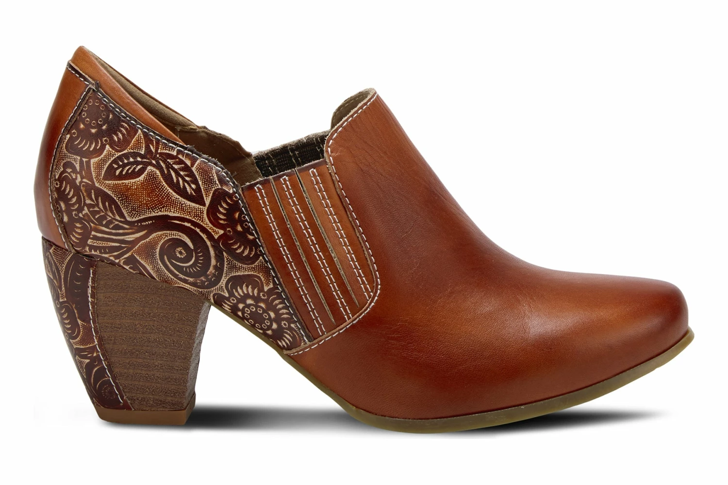 L`Artiste Style: Leatha -Western- inspired Slip-on shootie detailed in hand-painted and tooled leather on a matching tooled leather-wrapped curved stacked heel with inside and outside symmetrical leather covered elastic goring for easy on/off.