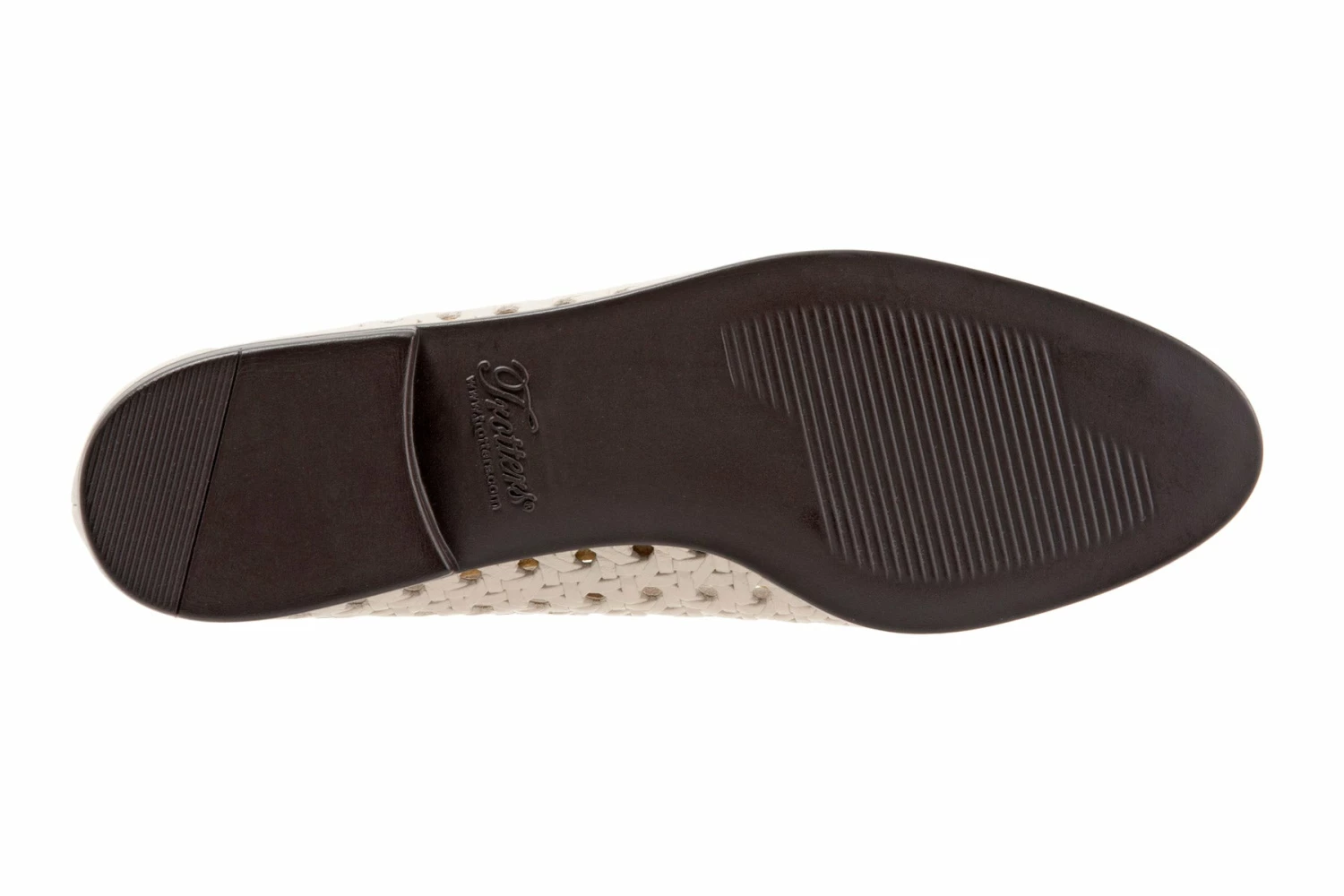 - Woven leather upper with a rounded toe.