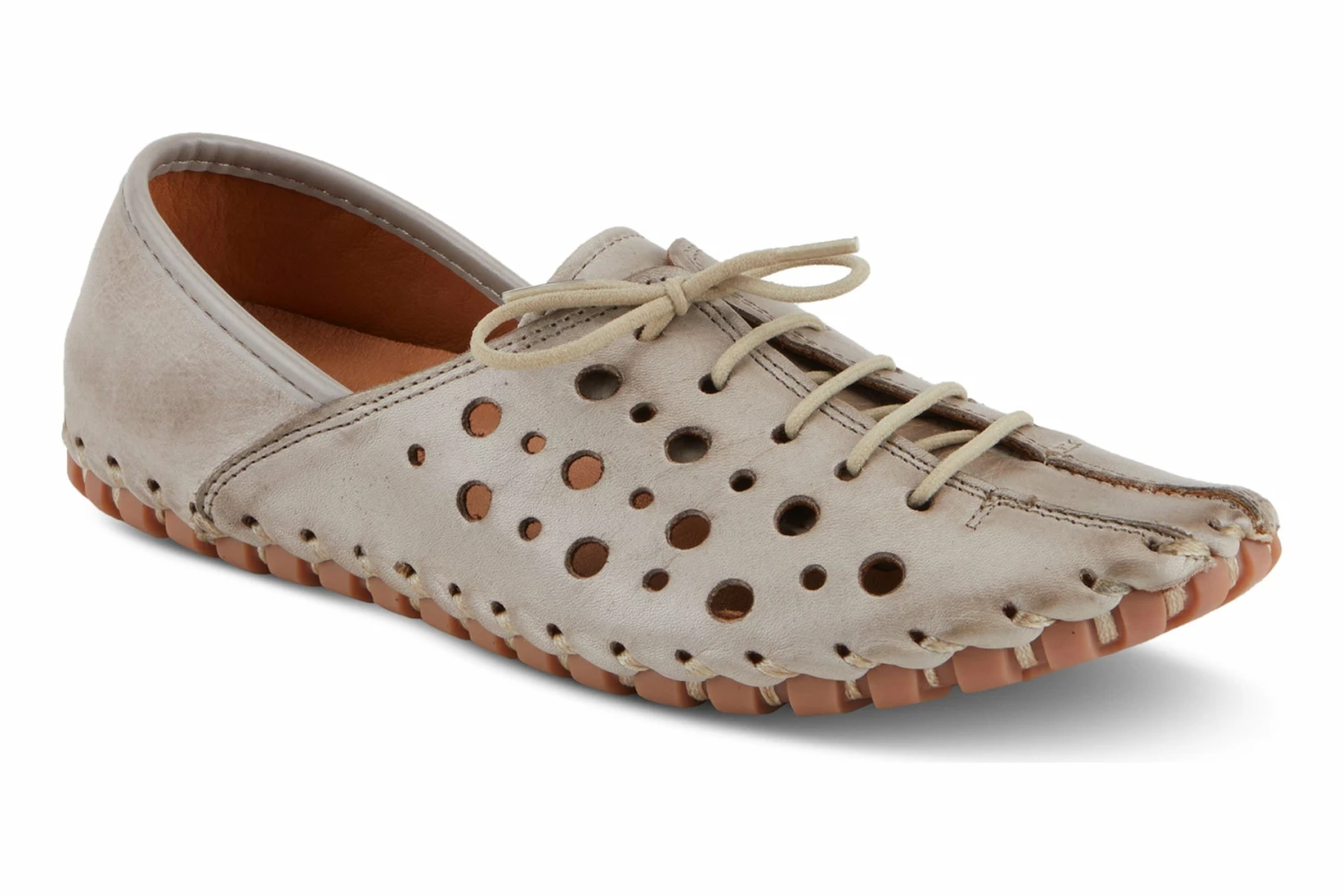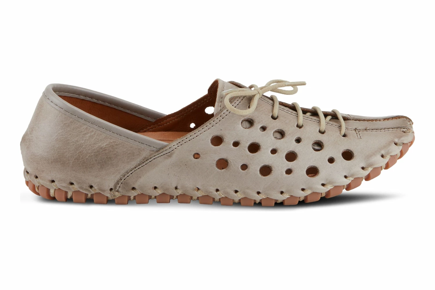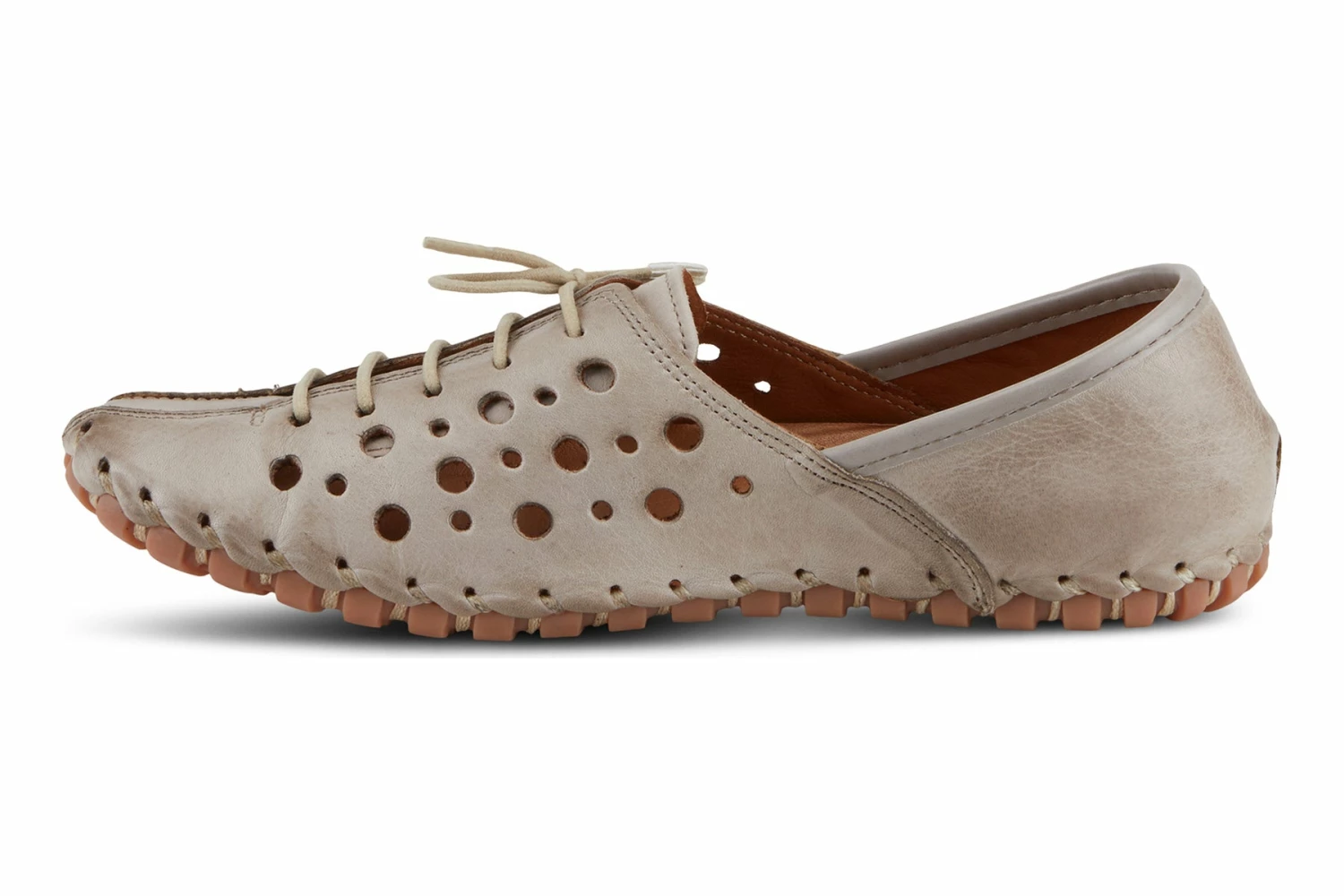 Circular laser cutout on the vamp and exposed contrast stitch trim with elastic laces for a perfect fit. Super lightweight, flexible, rubber outsole on the opanka construction.