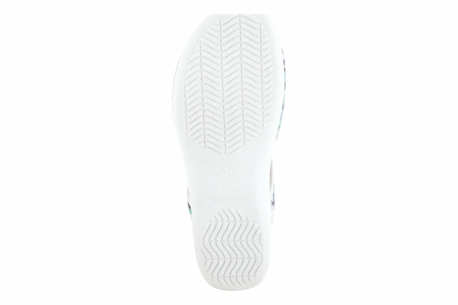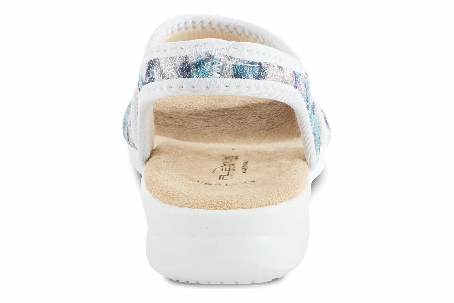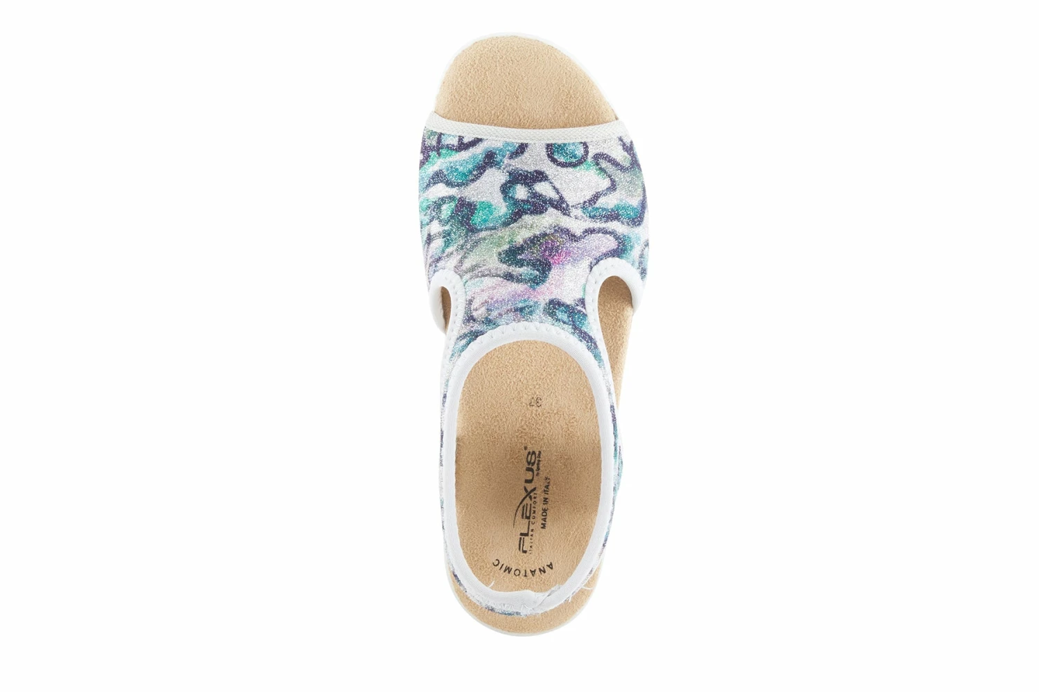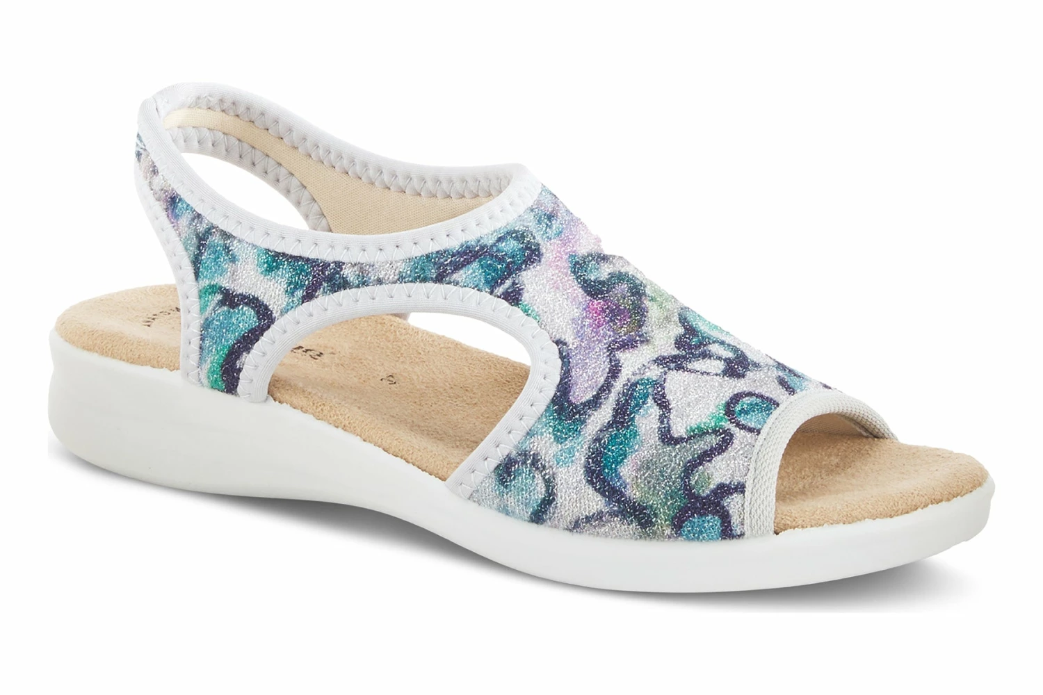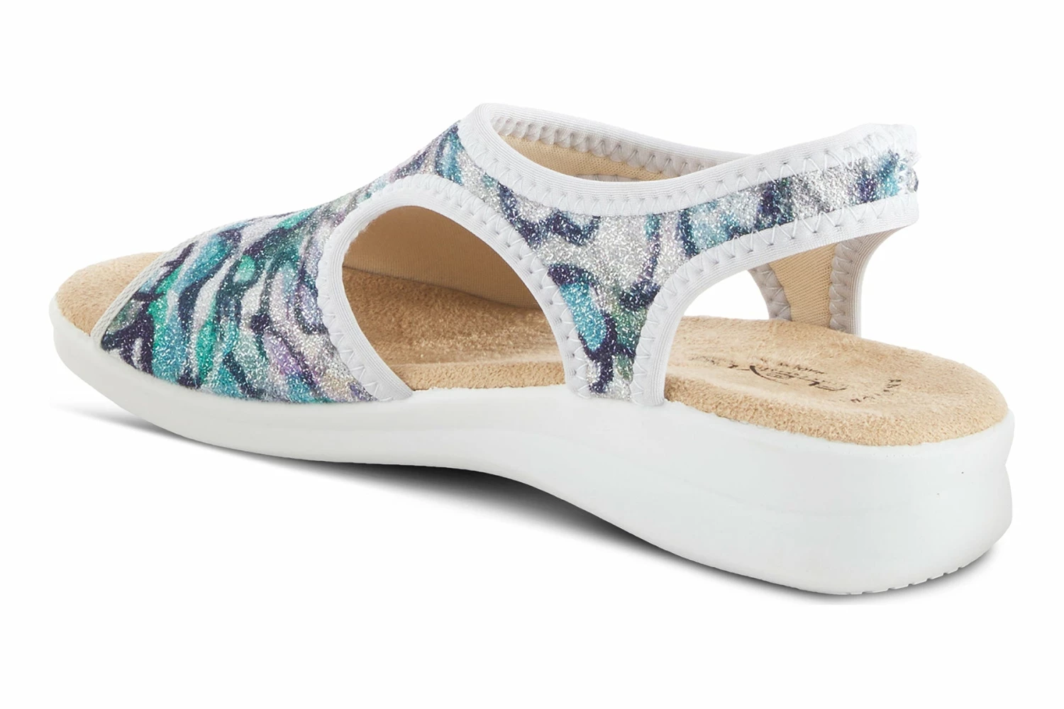 An Italian slingback sandal featuring lycra stretch upper and back strap with a multicolor swirl print design, all on a comfort-padded anatomical footbed and flexible, anti-shock wedge sole for superior comfort.
