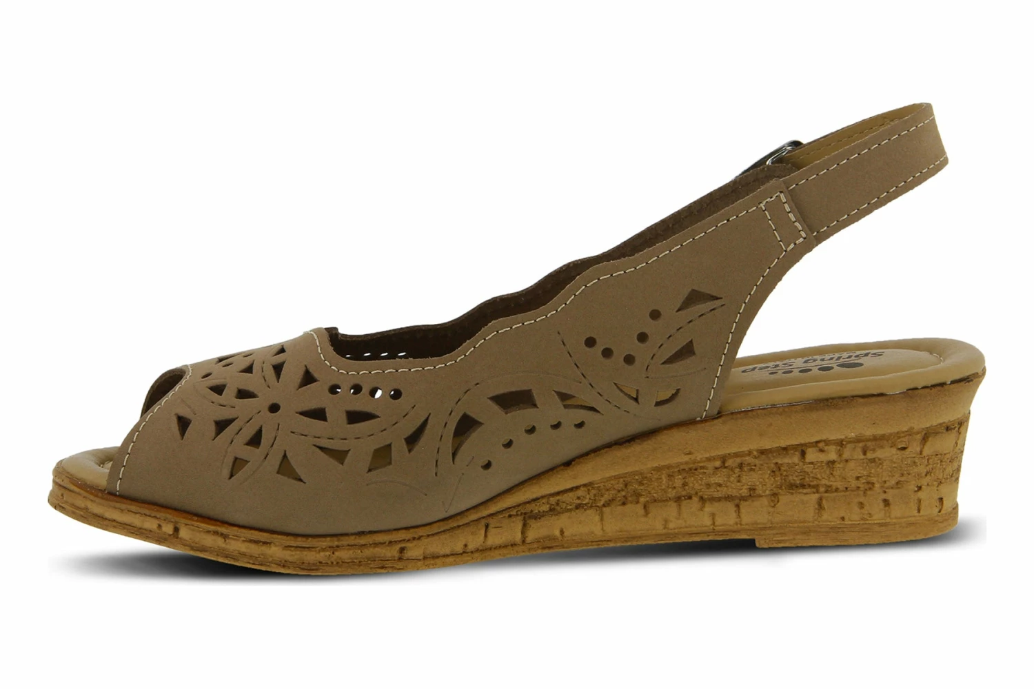 Mid-heel sling-back wedge sandal featuring a floral laser-cut upper and cork-inspired textured wedge.