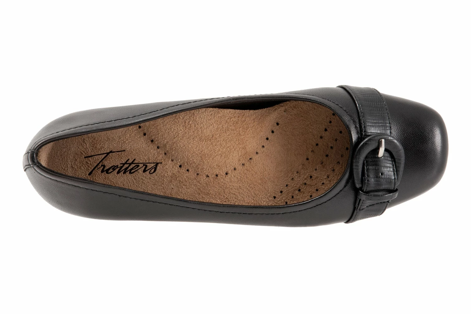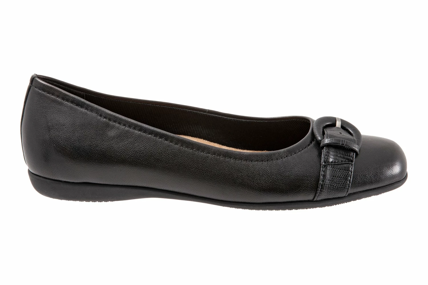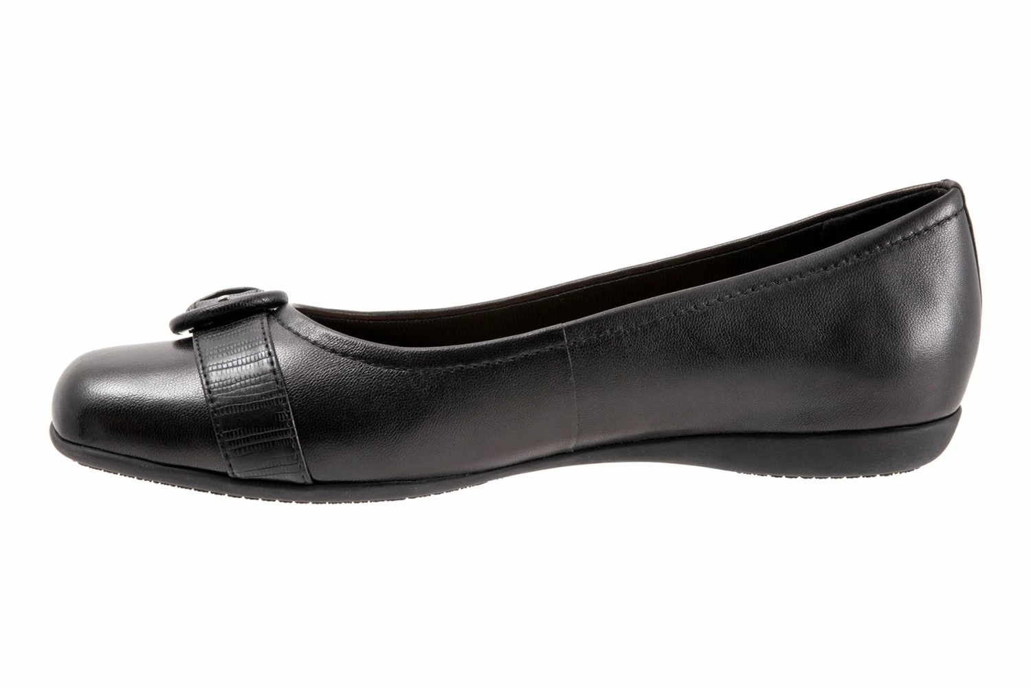 Polished belt detailing embellishes the vamp of a classic ballerina flat crafted from premium burnished leathers on a flexible, all day rubber sole.