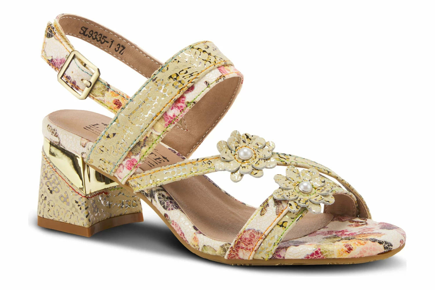 Beautiful asymmetrical quarter strap sandal ornate with three-dimensional flowers with dainty pearls on leather and gold wrapped heel. Adjustable back strap with a hook and loop closure and inside incorporate elastic for a better fit.