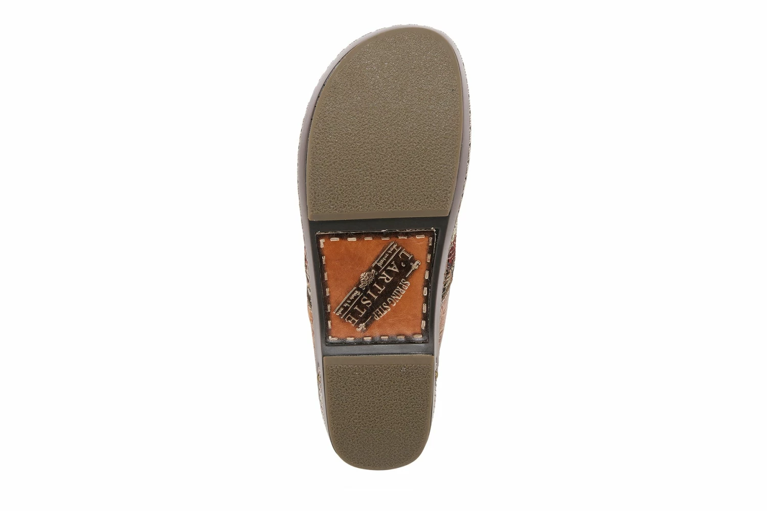 L`Artiste ZIGINO Fashionable backless leather combo clog with gorgeous woven textile and debossed floral leather on an incredibly comfortable outsole.
